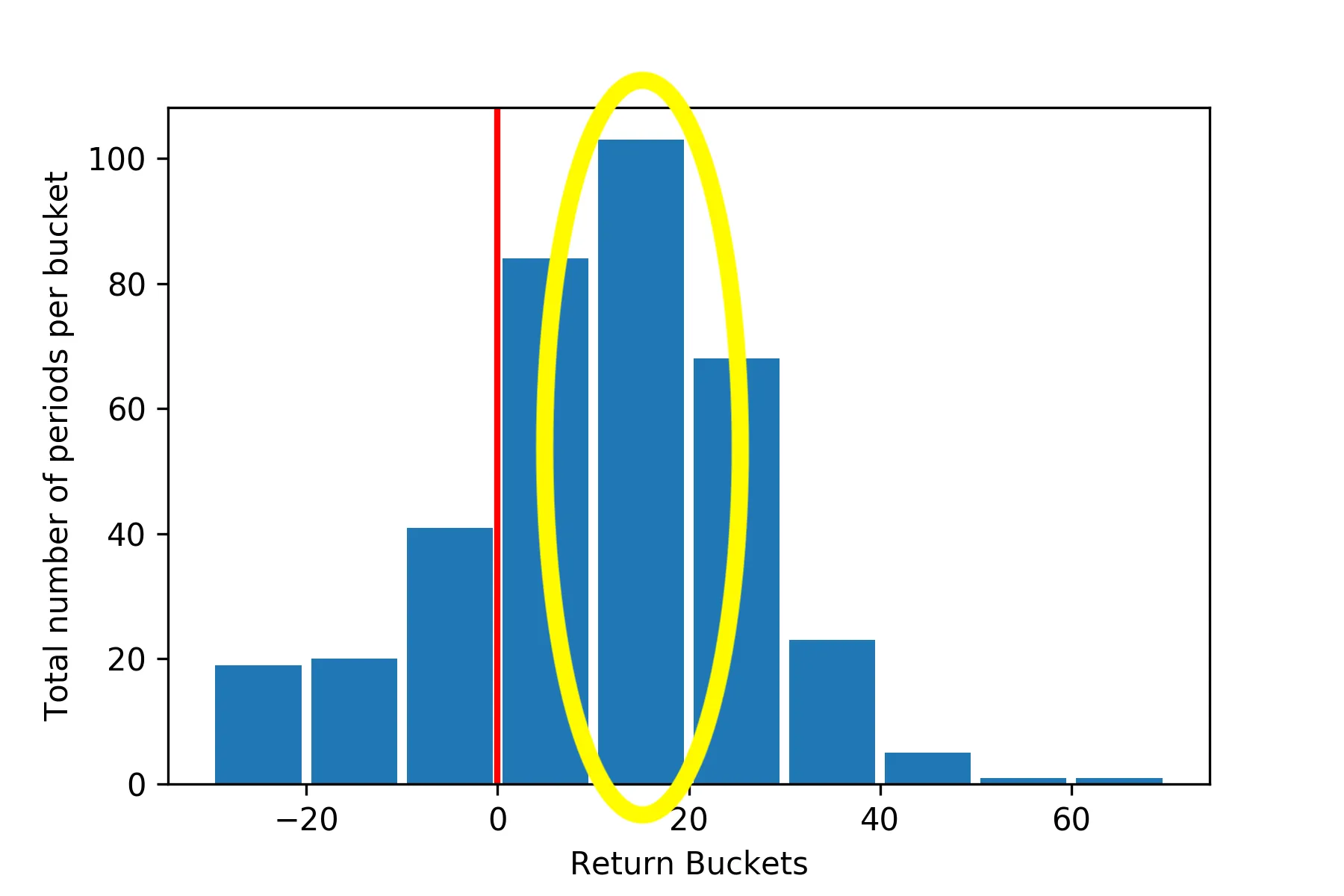 This histogram shows us that over a one-year investment horizon, the returns investors made were mainly in the range of 10-20%. In fact, the majority of the bars, particularly the big ones are to the right of the 0% mark - shown by the red vertical line - meaning that the returns were generally positive. This is called positive skew (*incorrect, skew is in relation to the average) and relates to what we said earlier: stocks tend to have asymmetric returns. Their returns are generally more positive than negative.