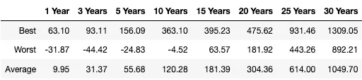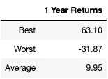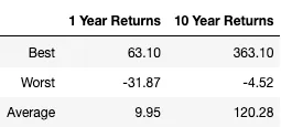 As you can see, in the best 1 year period, the index returned over 63%. In it’s worst year, it lost nearly 32%.