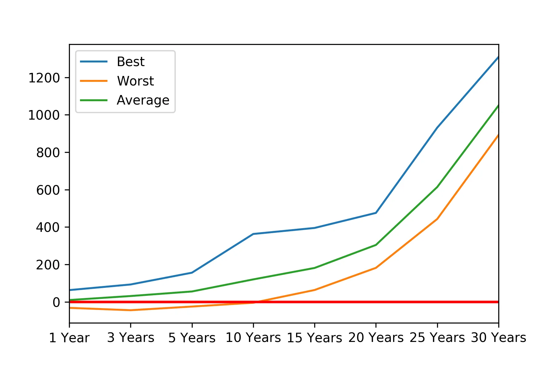This data by itself is pretty ugly, so let’s try and make it look a little bit nicer. Here is the same data as above, but shown as a graph. For each of our time horizons, we can see the best return (blue line), the worst return (orange line) and the average return (green line).