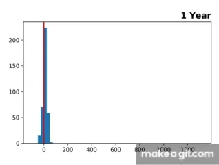 Let’s look at this over varying time frames and see how the returns shape up. We are going to look at the returns spread for every single year up to 30 years. To make this a fair comparison, I have tweaked a few parameters such as changing the range of buckets and removing the gaps between the bars. This should hopefully make it easier to see the shape and compare between periods. I have also turned the results into a gif so you can easily see how the shape changes over time. Here it is: