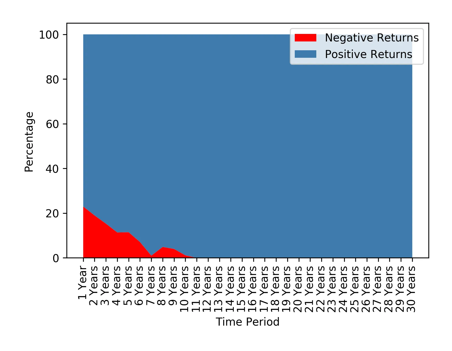As you can see, as soon as we hit the 11-year mark the returns are all positive (to the right of the red line) and the returns shoot off to the right, indicating much larger returns. This is past data, so who knows whether the future will be different. However, this shows us that as investors, the longer we can invest for the higher our chances of having a good experience and make decent returns.