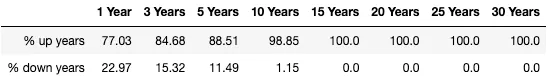 Let’s start with the first. Here I will write a script that looks at each of our time horizons and works out the percentage of the returns that were above 0% - ‘up years’ - and the percentage that were below or equal to 0% - ‘down years’. Here are the results in a table: